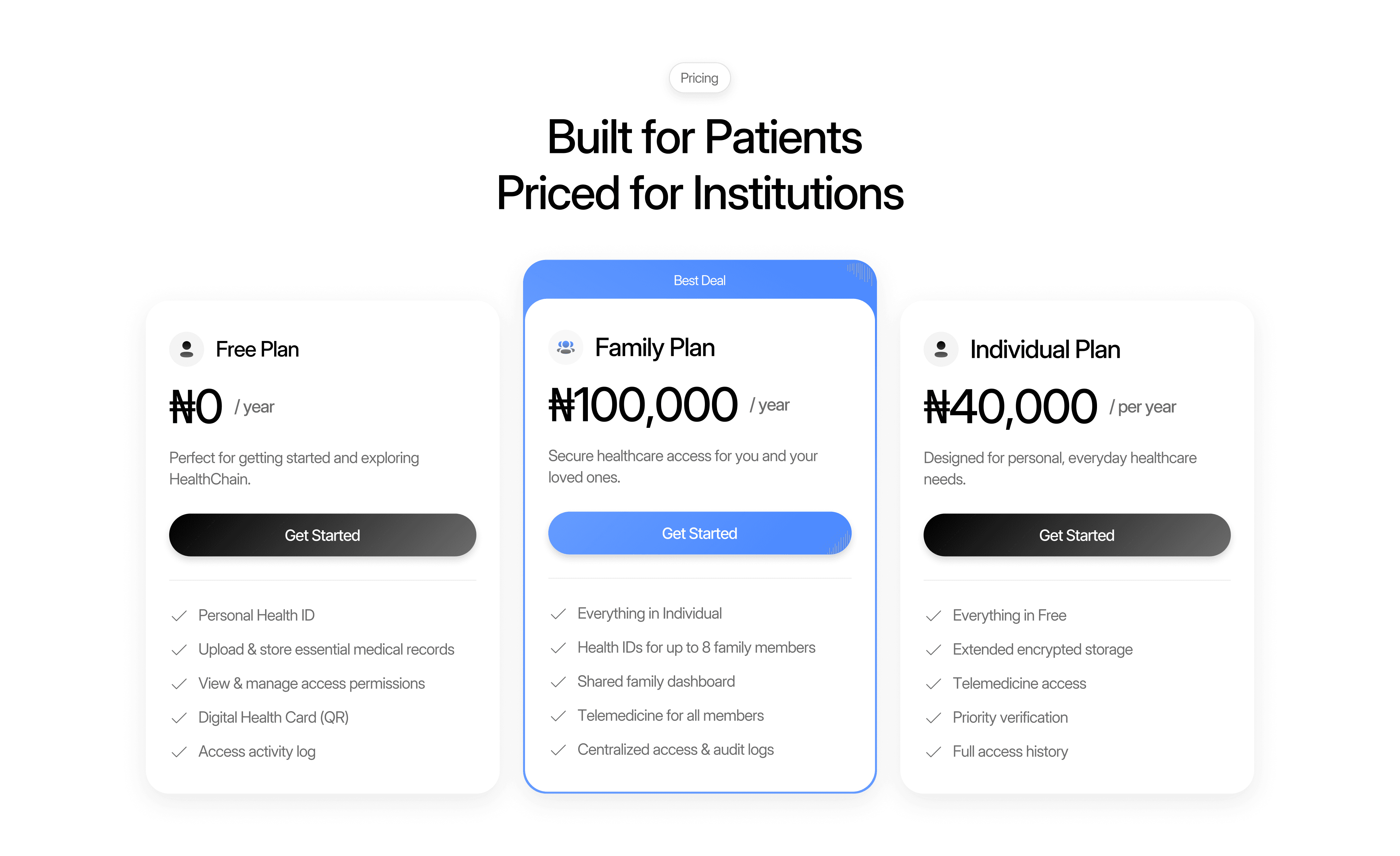 The goal of the HealthChain landing page was to clearly communicate the platform’s value and build trust with users. The design focuses on strong visual hierarchy, simple messaging, and a clean layout that explains the product while guiding visitors toward key actions.